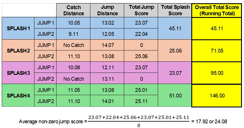 The score received for each jump will be added together to determine the team’s total score for that splash. The total scores received for each splash will be added together to determine the team’s final score for the tournament.
